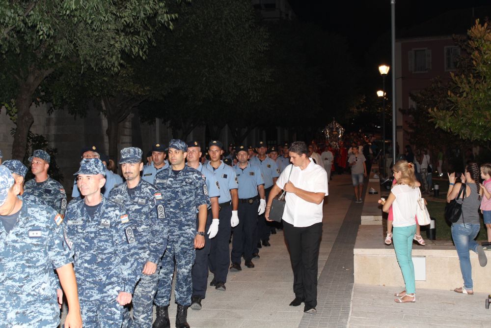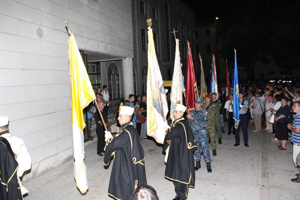 Na početku procesije prema Gradu sa slikom Gospe Sinjske vijorile su se zastave postrojba MORH-a i MUP-a, stjegovi djelatnih postrojbi Oružanih snaga Republike Hrvatske, Glavnog stožera Oružanih snaga Republike Hrvatske s pri stožernim postrojbama (Bojna za specijalna djelovanja, Središnjica elektroničkog izviđanja, Dom GS OS RH i Počasno-zaštitna bojna), Hrvatske kopnene vojske - Zapovjedništvo Hrvatske kopnene vojske s postrojbama: Hrvatska ratna mornarica - Zapovjedništva HRM-a i postrojbe; Hrvatsko ratno zrakoplovstvo i protuzračna obrana - Zapovjedništva HRZ-a i PZO; Zapovjedništvo Hrvatskog vojnog učilišta "Petar Zrinski"; Zapovjedništvo za potporu; stjegovi ustrojbenih cjelina MUP Republike Hrvatske, Ministarstva unutarnjih poslova Republike Hrvatske, Specijalne policije i Policijske akademije.