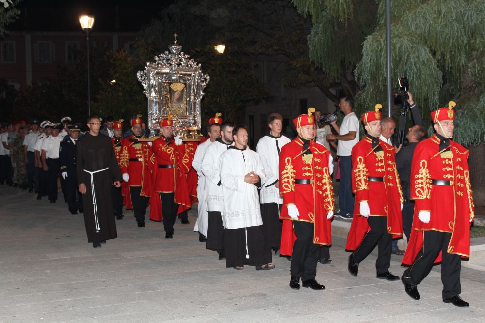 Župnik fra Ante Udovičić najavio je redoslijed i molitvu krunice za vrijeme procesije koja je ulicom Šetališta A. Stepinca, preko Pijace, uz Vatrogasni dom i obnovljenom stazom, uz koju su postavljene postaje križnog puta, do crkve na Gradu. Za vrijeme procesije u nošenju slike izmjenjivali su članovi vojske, policije i branitelja. Sliku su nosili također i fratri. Prolazeći ulicama Grada Sinja bilo je zanimljivo primijetiti kako su svi koji nisu bili u procesiji, vidjevši sliku i članove vojske, policije i branitelja, svi iskazali poštovanje i dostojanstvo, a vjernici su, znajući kuda ide procesija, upalili svijeće, iznijeli hrvatsku zastavu i posipali cvijećem Gospu.