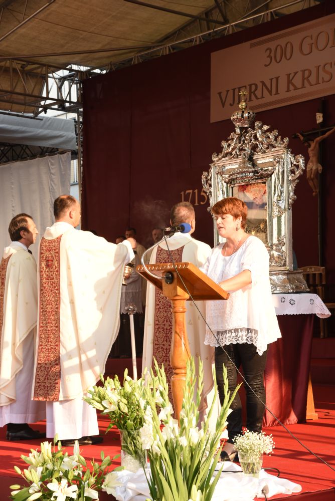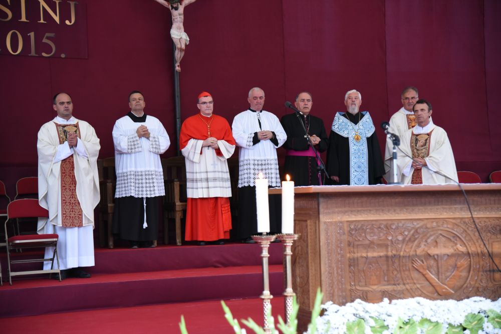 Zatim se kardinal Bozanić, na zamolbu mons. Barišića obratio prisutnima s pozdravom „Hvaljen Isusu i Marija!“, te zahvalio mons. Barišiću i ocu provincijalu Kodžomanu na pozdravnim riječima. Otac Kardinal je istaknuo da se ovdje nalazi u posebnom svojstvu te da želi posebno posredovati ljubav Oca Pape koju iskazuje prema okupljenima. U njegovo ime čestita ovaj visoki jubilej koji nas je sve okupio. Čestitao je prisutnima, zatim gradu Sinju, Cetinskoj krajini te čitavoj domovini te svim katolicima Hrvatima iz BiH.