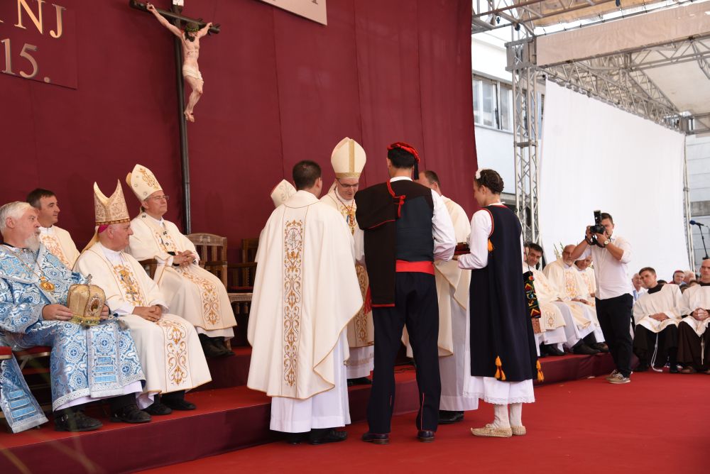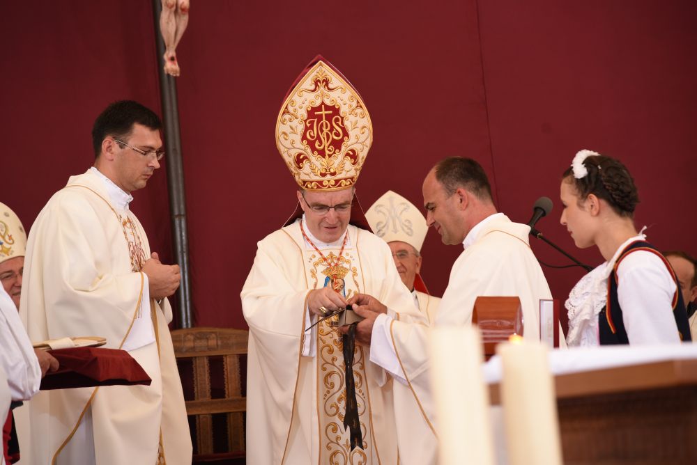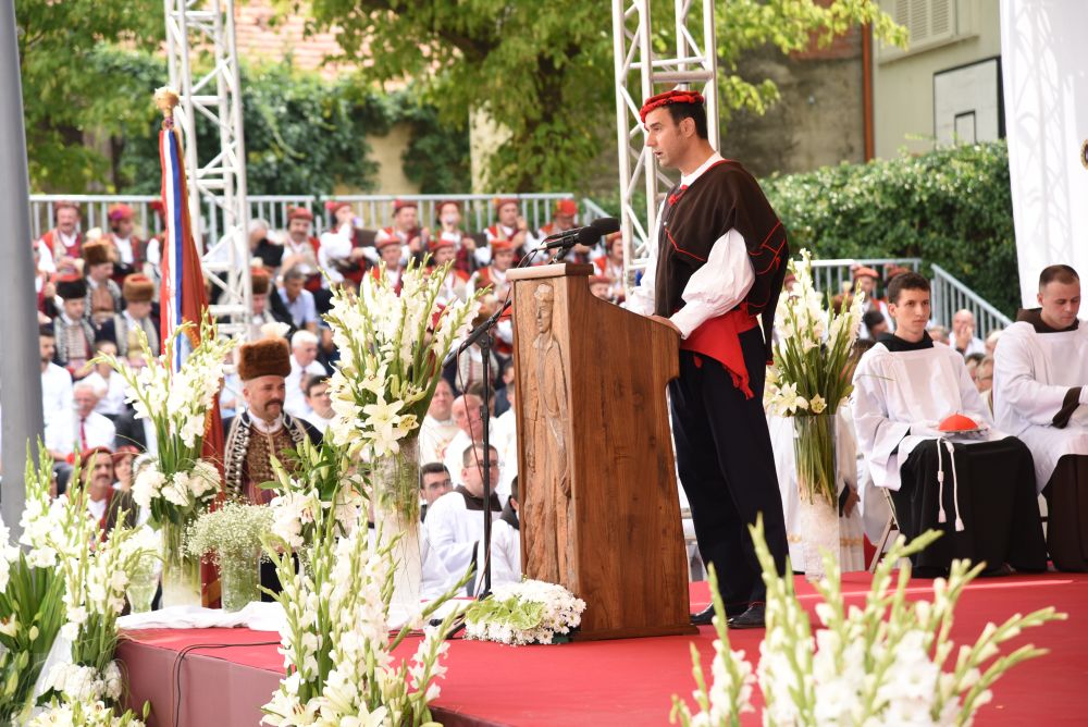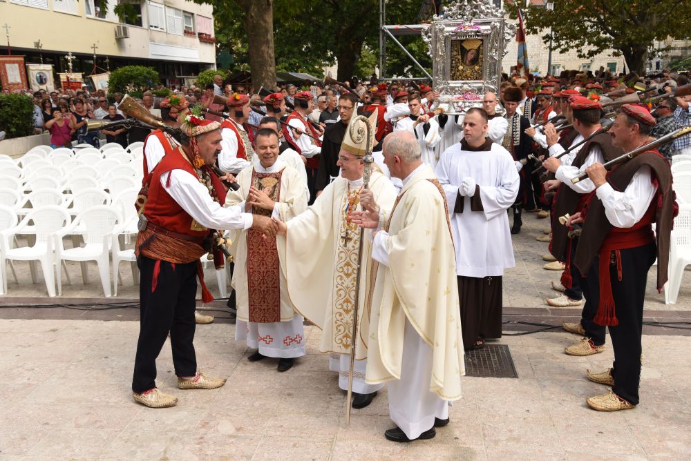 Otac Kardinal se zahvalio o. Provincijalu na primljenom daru, i prije blagoslova uputio riječ zahvale: „Draga braćo i sestre, mogu reći hvala, hvala za vašu vjeru, za vaše svjedočenje. Treba doći u Sinj na Veliku Gospu i ući u Svetište i vidjeti redove za ispovijed, sudjelovati u procesiji i slaviti Svetu misu … tek tu možemo osjetiti dušu i identitet ovog naroda. Ja zahvaljujem i čestitam … budite ponosni na ono što jeste. Čuvajte to i razvijajte, samo tako će preživjeti ovaj narod, ovaj puk hrvatski. Provincijal me iznenadio s ovim poklonom, ali treba biti ponizan i primiti poklon. Ovo je znak kako se stvara naša kulturna baština. Primam to kao Papin izaslanik i kao zagrebački nadbiskup … to će ostati u crkvi, u riznici i stoljećima nakon će se vidjeti kako se ovdje odvijalo veličanstveno slavlje. Kao Papin izaslanik predajem medalju svetoga Pape Ivana Pavla II. Ivan Pavao II je zadužio hrvatski narod i mi ćemo mu uvijek ostati zahvalni, u njemu imamo zagovornika na nebu.