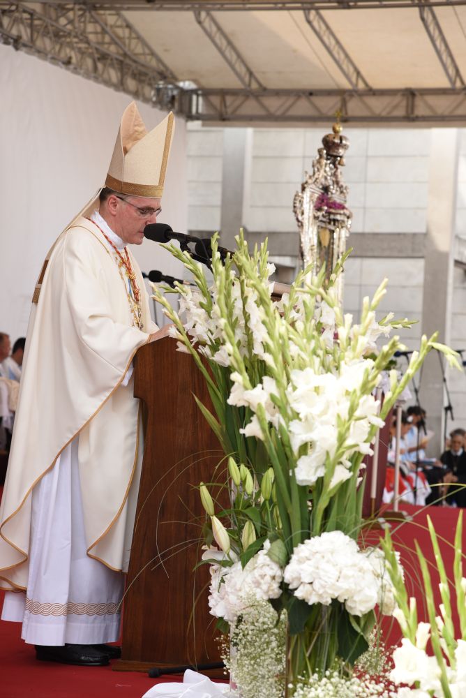 Uvodeći u homiliju, Kardinal je istaknuo da sinjska riznica čuva spomen na događaje iz prošlosti u kojima sa zahvalnošću promatramo očitovanje Božje prisutnosti po Blaženoj Djevici Mariji prije tri stoljeća. Potaknuo je vjernike da ne dopuste razdvajanje svoje vjere od društvene zbilje i od zalaganja za dobro, da se ne srame svjedočiti istinu neba u zemaljskim poteškoćama, te da ne zaniječu Boga i ne gube pouzdanje u njega.