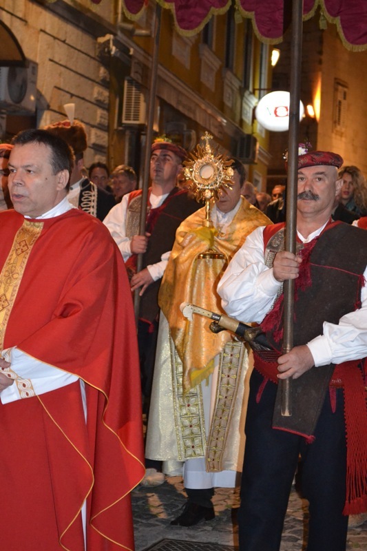 Nakon propovijedi uslijedilo je klanjanje križu, za vrijeme kojeg je Mješoviti zbor pod vodstvom fra Jure Župića i s. Jelene Mijić pjevao korizmene napjeve što je doprinijelo snažnom iskustvu sjedinjenja s Isusovom patnjom. Poslije svete pričesti upriličena je procesija s Presvetim Oltarskim sakramentom ulicama Sinja. Mnoštvo vjernika sudjelovalo je u molitvi i pjesmi.