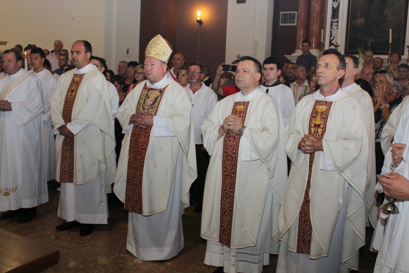 Mons. Marko Semren, pomoćni biskup banjalučki, uvodeći u slavlje, rekao je: „Oče Provincijale fra Joško, draga braćo i sestre, dragi hodočasnici, dragi štovatelji BDM, nalazimo se uoči svetkovine Uznesenja BDM u svetištu Gospe od Milosti u Sinju i svjesni smo da nas je danas okupila Božja ljubav, Božja dobrota, te Božje milosrđe koje se očitovalo u BDM uznesenoj na nebo, koja je okupljala kroz stoljeća naše pretke: pradjedove, prabake, djedove, bake, očeve, majke. U nebo uznesena. U Mariji, koja je u nebo uznesena, ostvaruje se evanđeoska misao koja glasi: „Tko se uzvisuje, bit će ponižen; a tko se ponizuje, bit će uzvišen“ (Mt 23,12). S križa Isus je povjerio Majku svakome svome učeniku, a u isto je vrijeme povjerio i svakoga svoga učenika ljubavi svoje Majke. Dakle, u najuzvišenijem trenutku dovršenja mesijanskoga poslanja, Isus svakome od svojih učenika ostavlja, kao dragocjenu baštinu, samu svoju Majku, Djevicu Mariju. Stoga odstranimo grijeh i dopustimo da Bog bude u nama, s nama i među nama, da nam po zagovoru BDM ojača vjeru, učvrsti nadu, usavrši ljubav te ublaži naše duševne i tjelesne boli, ozdravi, utješi, ohrabri“, završio je mons. Semren.