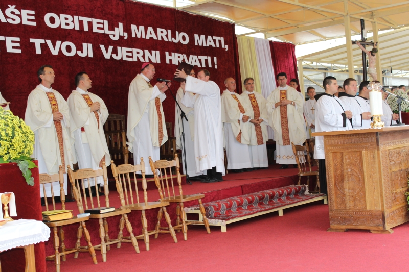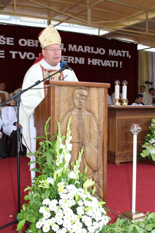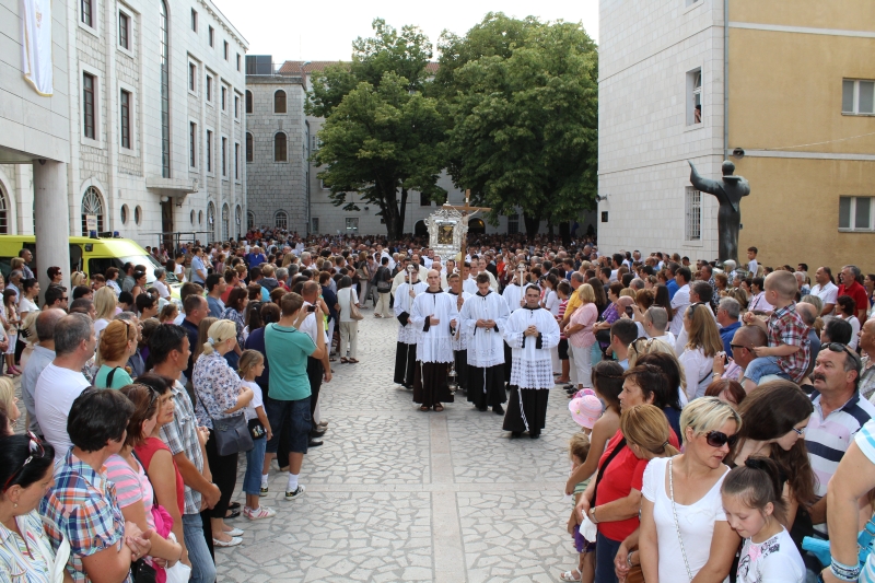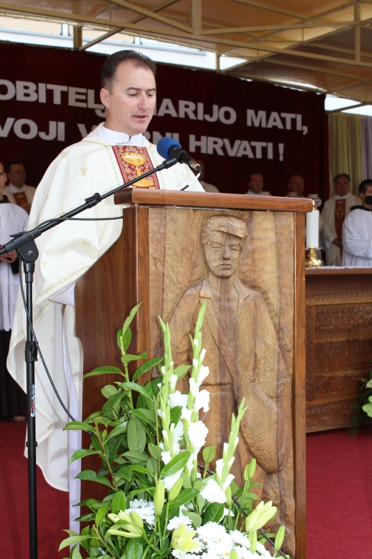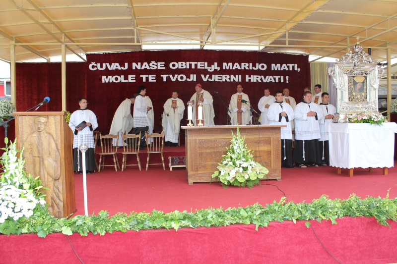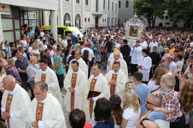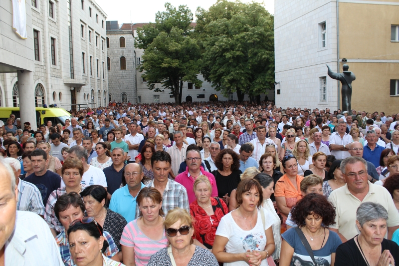 Braćo i sestre, dragi štovatelji BDM, dragi hodočasnici, nalazimo se u svetištu Gospe Sinjske - Ramske i slavimo svoju zaštitnicu BDM koja nas potiče da ponovno otkrijemo radost vjere u sebi, i da iznova pronađemo zanos za prenošenje vjere kako su to učinili naši ujaci i naši preci s koljena na koljeno. Radost i zanos, radost vjere i zanos u vjeri koju se na različite načine svjedoči i prenosi drugima. Večeras slavimo svetkovinu Uznesenja BDM ili ulazak u nebo BDM, to je dan u koji je ona završila svoj zemni život i prešla u slavu svoga nebeskoga Oca. Ona je uzor svoj Crkvi, uzor svakom pojedincu, kršćaninu a njezin svršetak, tj. njezina konačna proslava je izazov i poziv svima nama da krenemo njezinim stopama, stopama njezine vjere, njezinog predanja Božjoj volji kako bismo stekli vijenac koji je njoj već dodijeljen. Krist je svojoj Crkvi ostavio trostruki dar od kojega živi: svoju božansku Riječ i u njoj istinu o Bogu i čovjeku, sama sebe u euharistiji i svoju Majku. U čemu je njezina veličina?