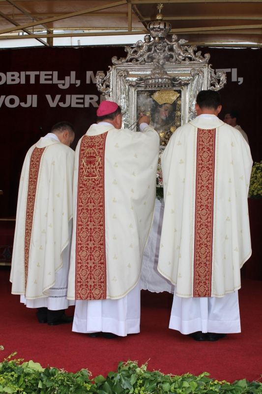Na kraju slavlja župnik fra Ante Bilokapić je obavijestio o slavlju svetih misa na svetkovinu Velike Gospe kao i vrijeme ispovijedanja. Potom je fra Petar Klapež, gvardijan i upravitelj Svetišta, zahvalio mons. Marku Semrenu, pomoćnom biskupu banjalučkom, propovjednicima kroz devetnicu fra Željku Toliću, don Josipu Perišu, fra Nevenu Pavlinušiću i fra Damiru Ćiri Čikari, svim svećenicima koji su bili na raspolaganju za sakrament pomirenja. Pozdravio je fra Joška Kodžomana, provincijala Franjevačke provincije Presvetog Otkupitelja, prisutne svećenike, časne sestre, hodočasnike iz Rame kao i sve hodočasnike iz BiH, svih dijelova Hrvatske i inozemstva. Na kraju je zamolio mons. Marka Semrena za blagoslov nad cijeli hodočasnički narod. Euharistijsko slavlje završilo je blagoslovom s Gospinom slikom i himnom "O Gospe Sinjska", nakon čega je Slika vraćena u crkvu.